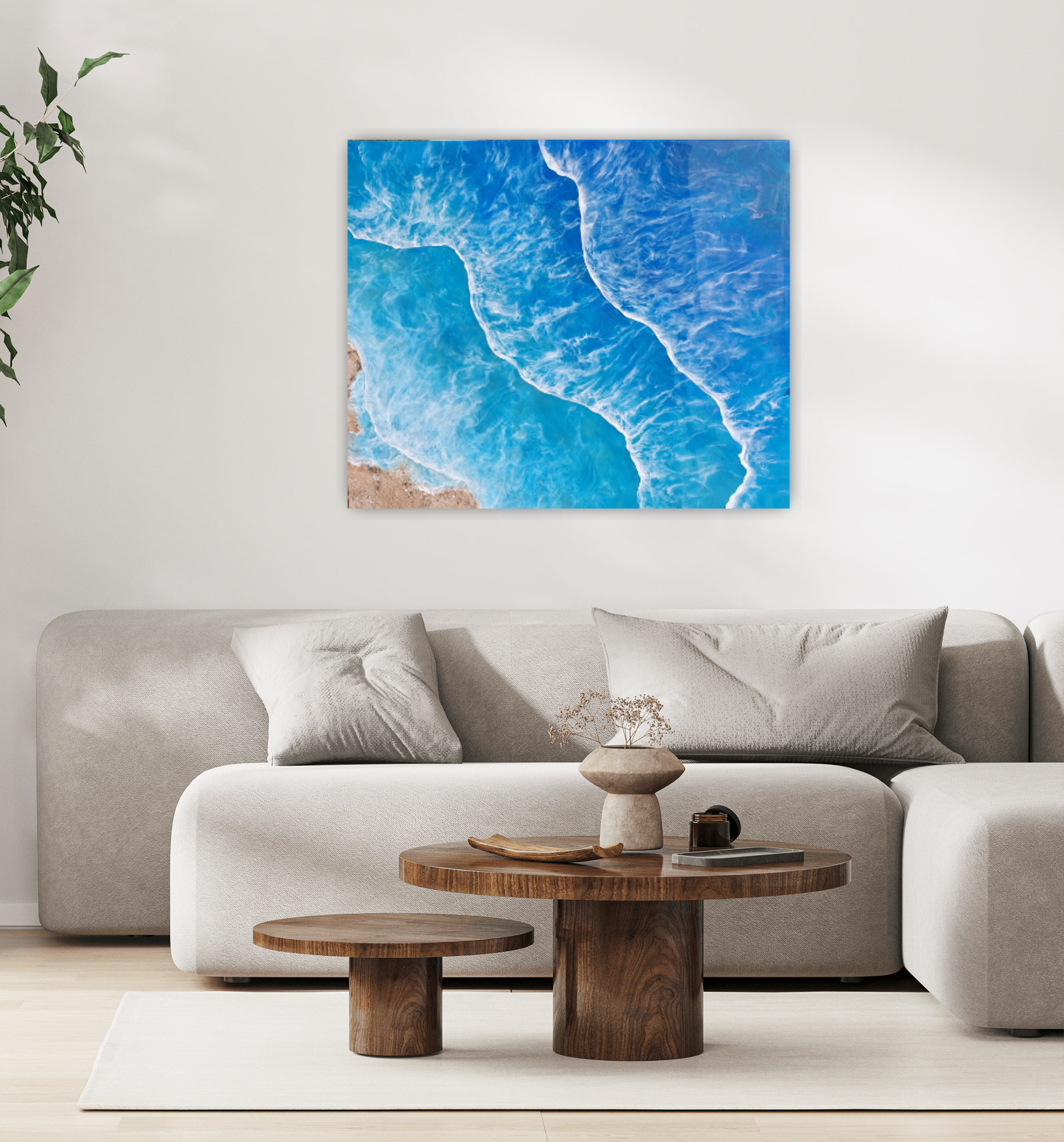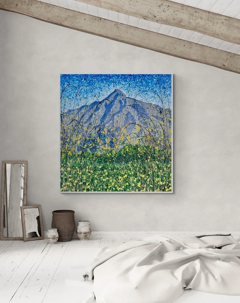 Acrylic on canvas with floating wooden frame. Finished in the colour of your choice.
